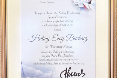 Podczas sesji Rady Gminy Sierakowice (30.12.2025r.) już po raz 19. wręczono nagrody dla Najlepszych Absolwentów Szkół Podstawowych w zakresie języka kaszubskiego. Wśród sześciu wyróżnionych znalazła się uczennica Szkoły Podstawowej im. Jana Pawła II w Gowidlinie – Aleksandra Rompa. Ola wykazała … Czytaj dalej 19. edycja nagrody Haliny Ewy Buchacz