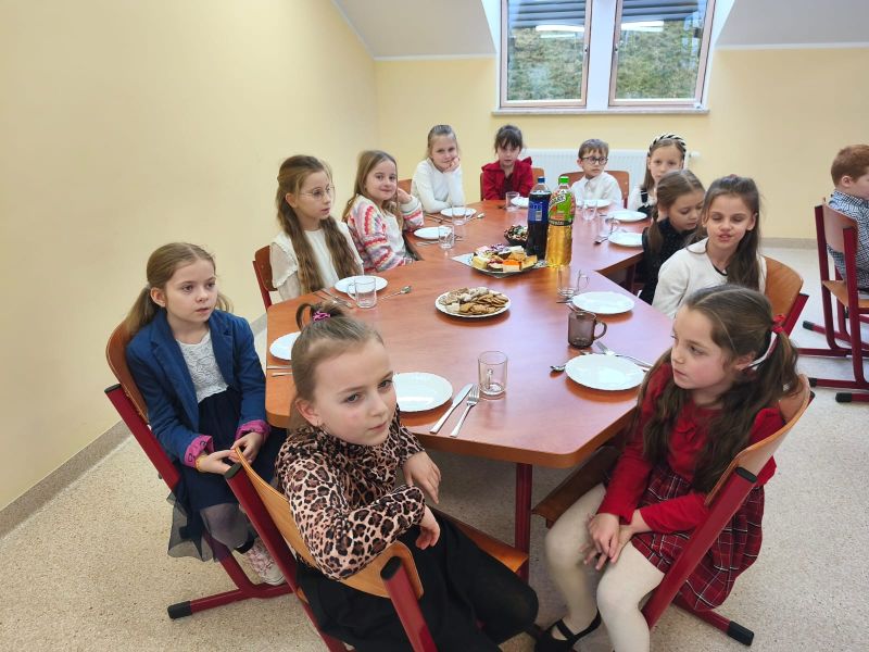 O świąteczne stoły zatroszczyły się mamy naszych uczniów, piekąc ciasta, za które serdecznie dziękujemy. Szczególne słowa wdzięczności kierujemy dla pań: Agnieszki Choszcz oraz Beaty Lis, które przygotowały poczęstunek oraz pani Elżbiecie Kuchcie, która służyła pomocą przy realizacji naszego spotkania.