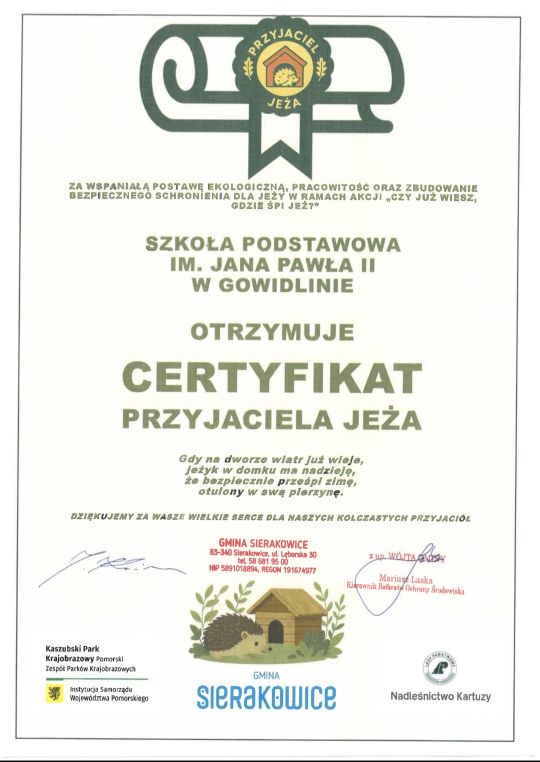 Tego dnia nasza szkoła otrzymała także certyfikat Przyjaciela Jeża, z czego jesteśmy bardzo dumni. Takie inicjatywy uczą wrażliwości, odpowiedzialności i troski o przyrodę już od najmłodszych lat.