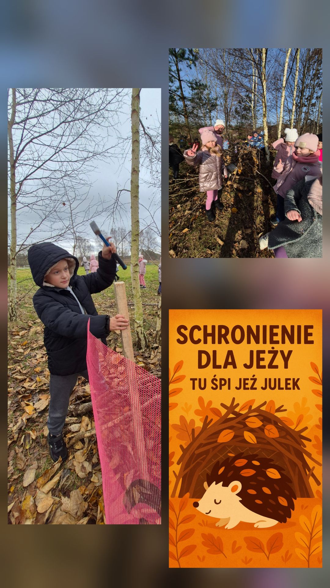 Uczniowie obejrzeli film edukacyjny, dzięki któremu dowiedzieli się, jak wygląda codzienne życie jeża, jakie zagrożenia na niego czyhają oraz jak możemy zadbać o jego bezpieczeństwo. Następnie, na terenie szkoły wspólnie zbudowali schronienie dla jeża, wykorzystując naturalne materiały-gałęzie, patyki i liście. Powstałe miejsce zostało zabezpieczone siatką oraz odpowiednio oznaczone informacją, że jest to schronienie dla jeża.