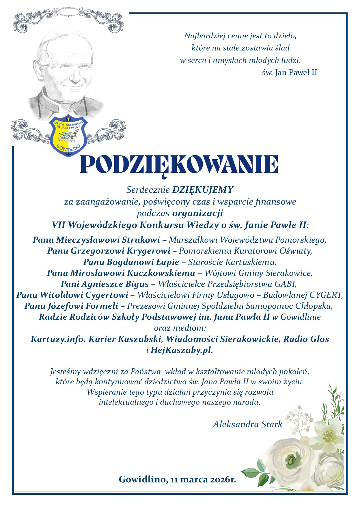 Już dziś z radością zapowiadamy kolejną edycję Wojewódzkiego Konkursu Wiedzy o św. Janie Pawle II. Wierzymy, że także w przyszłym roku spotkamy się ponownie, aby wspólnie odkrywać bogactwo nauczania Papieża Polaka, rozwijać pasje młodych ludzi oraz budować przestrzeń inspirujących spotkań i wymiany doświadczeń.